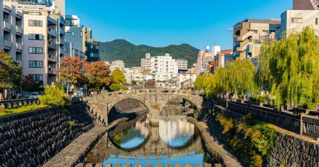 建於1634年的眼鏡橋,是現存最古老的拱形石橋之一。相傳因橋影倒映在水面上形成兩個圓弧,宛如一副「眼鏡」,因此得名。眼鏡橋與東京的「日本橋」、山口的「錦帶橋」並列為「日本三大名橋」。當水位較低時,可沿著階梯下到河岸邊散步,近距離欣賞橋身與中島川的風景。從眼鏡橋一路延伸至中島川護岸還藏著幾顆「愛心石」,被視為祈求戀愛成真的能量景點,近年也蔚為話題。